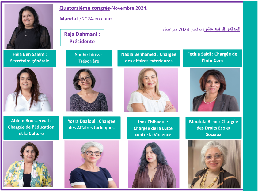 sous le slogan :Féministes en résistance… Unies contre l’oppression et les violations. Le nouveau bureau est présidé par Raja Dahmani.