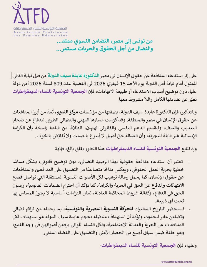 Suite à la convocation de la défenseure des droits humains en Égypte, la Docteure Aïda Seif El-Dawla, par le parquet de Dokki pour comparaître devant le parquet de la Sûreté de l’État le dimanche 15 février 2026, dans l’affaire n° 809 de l’année 2026 – Haute Sûreté de l’État, sans précision des motifs de la convocation ni de la nature des accusations, l’Association Tunisienne des Femmes Démocrates exprime sa solidarité totale et inconditionnelle avec elle.