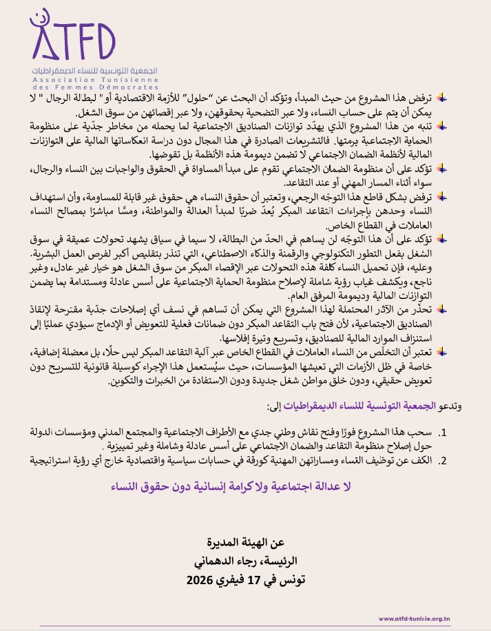 – Rejette catégoriquement cette orientation régressive, et considère que les droits des femmes sont non négociables, et que cibler les femmes seules par des mesures de retraite anticipée constitue une atteinte aux principes de justice et de citoyenneté, et une atteinte directe aux intérêts des femmes travaillant dans le secteur privé.