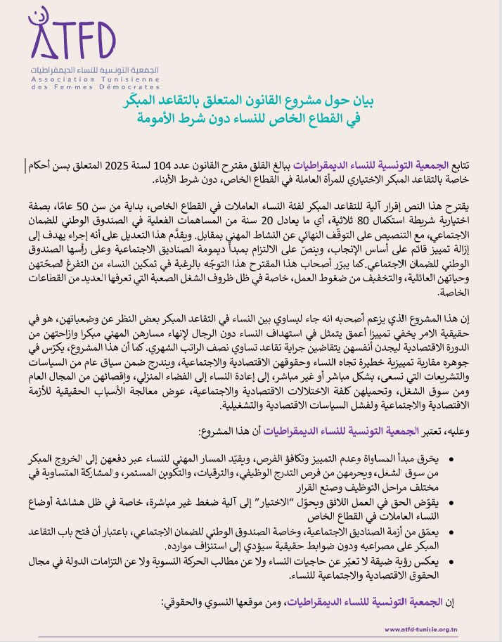 L’Association Tunisienne des Femmes Démocrates suit avec une vive inquiétude la proposition de loi n° 104 de l’année 2025 relative à l’instauration de dispositions spéciales concernant la retraite anticipée volontaire pour les femmes travaillant dans le secteur privé, sans condition d’enfants.