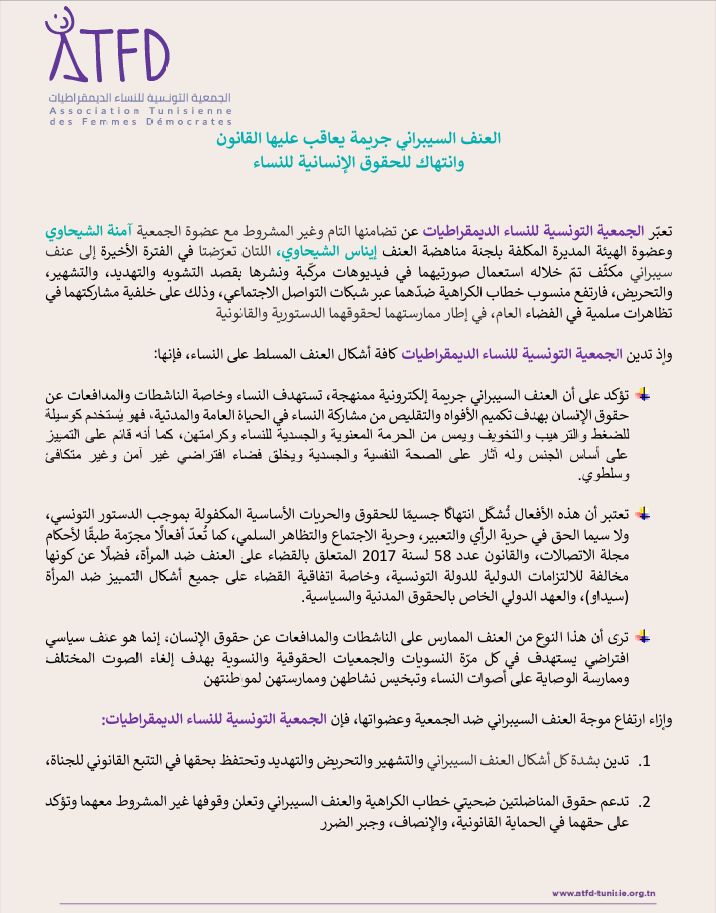 Face à la recrudescence de la cyberviolence ciblant l’Association et ses membres, l’Association Tunisienne des Femmes Démocrates :
