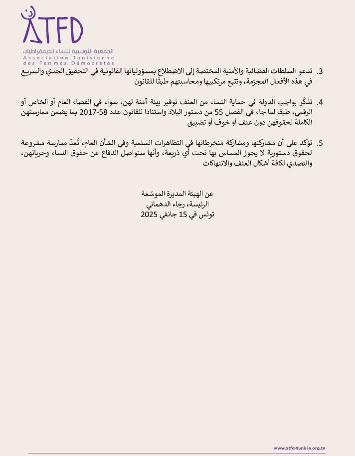 Rappelle l’obligation de l’État de protéger les femmes contre toutes les formes de violence et de garantir un environnement sûr, que ce soit dans l’espace public, privé ou numérique, conformément à l’article 55 de la Constitution tunisienne et à la loi n°58-2017, afin d’assurer l’exercice effectif de leurs droits sans violence, sans peur ni intimidation.